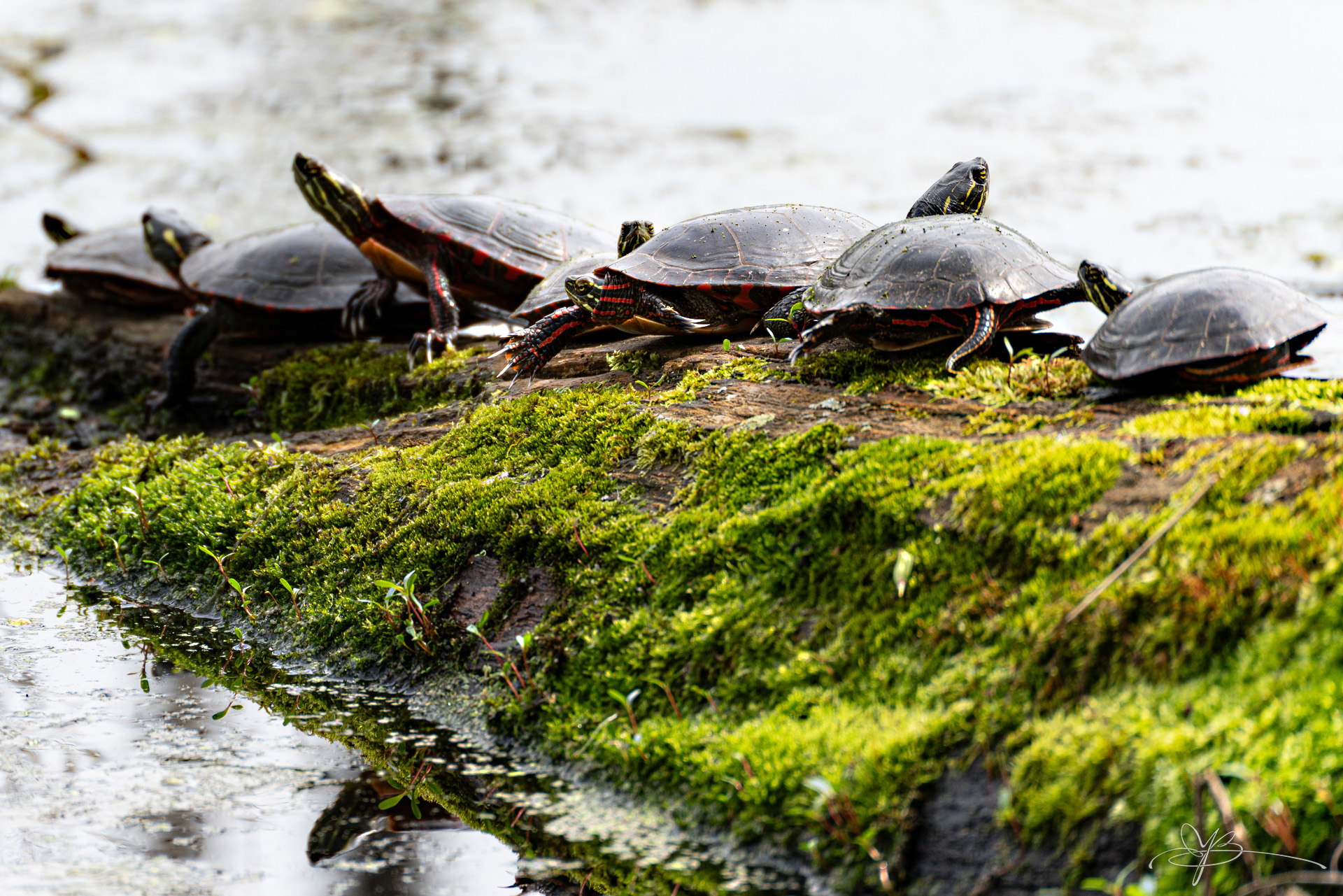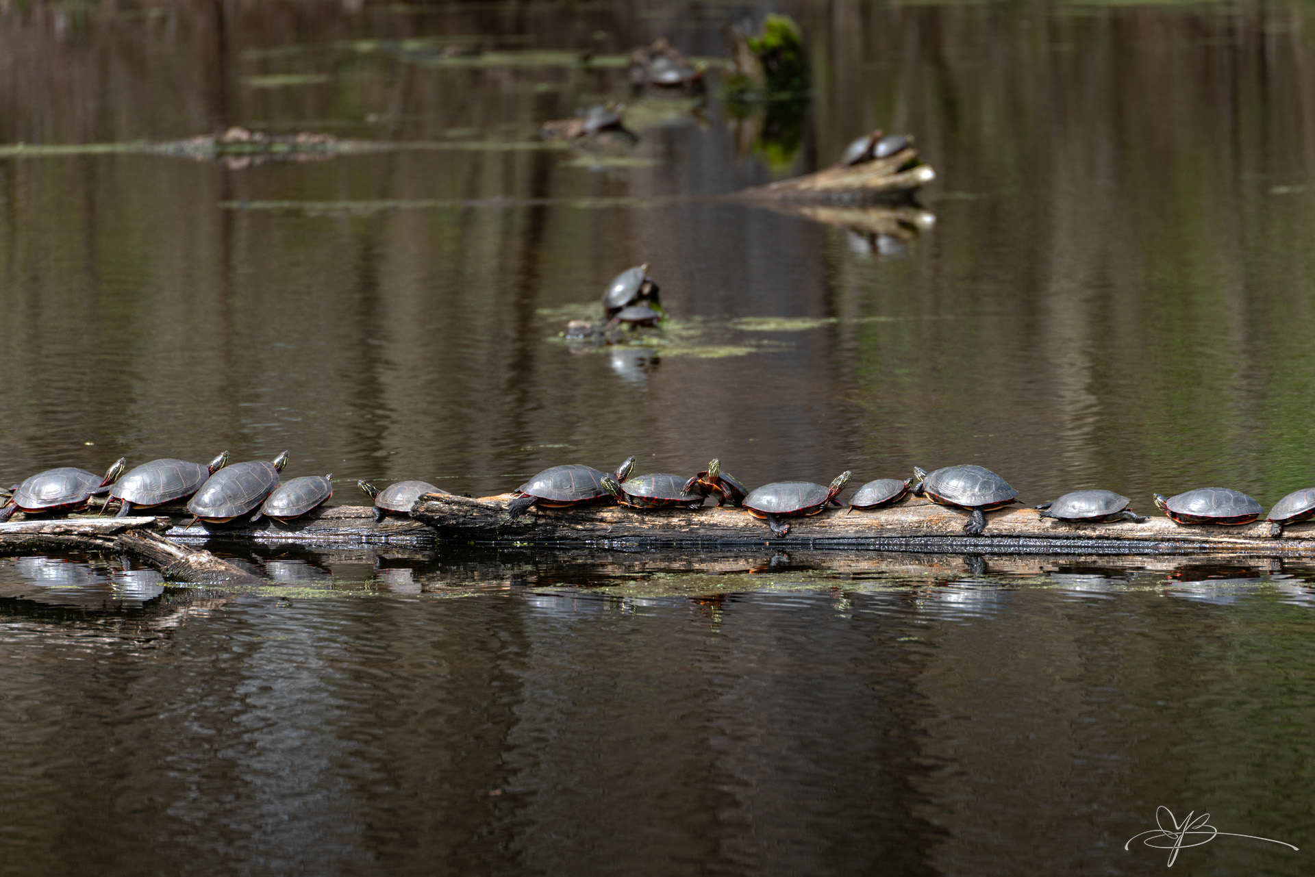 Это я вчера решил прогуляться с альтернативными целями - не за цветочками, а поснимать всякую живность. Белочек там или оленей, кто подвернется. Подвернулось болото с черепахами: у нас уже лето, они повылезали из-под воды за ультрафиолетом и загорают вовсю. Люблю их снимать, они лежат на месте и никуда не двигаются. Даже лучше, чем цветочки: черепах ветром не мотает. Правда, если наступить на какую-нибудь ветку, они все стремительно сигают со своих бревен в воду.